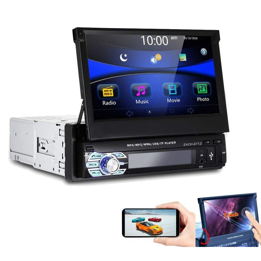 Autoradio 7 Pollici a Scomparsa, Schermo Retrattile, Bluetooth, USB con Telecomando