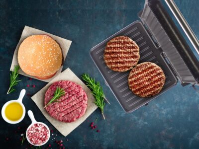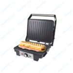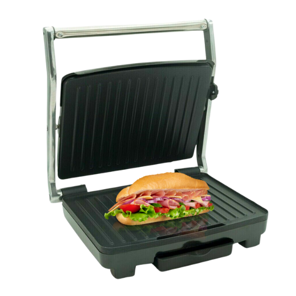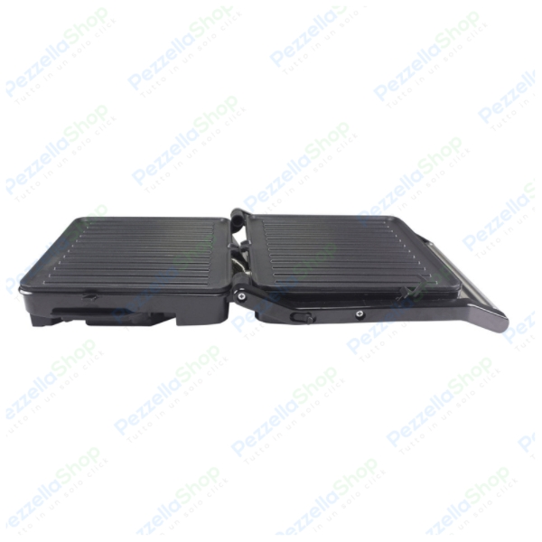 Bistecchiera multifunzione con struttura in acciaio e bachelite e con piastre grill da 29×24 cm in alluminio pressofuso con rivestimento antiaderente, adattabili allo spessore dei cibi. Possibilità di apertura delle piastre a 180° per aumentare la superficie di cottura. Termostato per il controllo della temperatura. Dotata di due spie luminose di funzionamento e raggiungimento della temperatura. Vassoio raccogli-grassi removibile e stabili piedini antiscivolo.