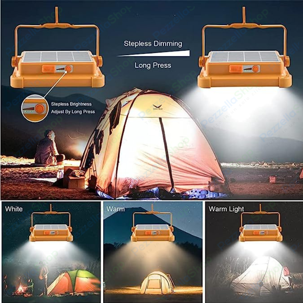 Massima luce, ovunque tu sia! Il faro LED solare ricaricabile LaPaginaDegliAffari da 300W è la soluzione perfetta per il lavoro all’aperto, il campeggio, l’emergenza o l’utilizzo in ambienti senza corrente. Dotato di 498 LED totali, fornisce luce fredda, luce calda e RGB (rossa e blu). Con funzione power bank, ricarica anche i tuoi dispositivi. Compatto, potente, e completamente autonomo grazie al pannello solare integrato.