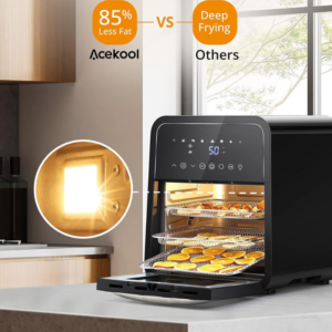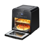 Ideale per la cottura di bistecche, patatine, frutta secca, pane, pollo, pesce e gamberi grazie ai suoi 8 programmi intelligenti preimpostati. È possibile controllare semplicemente la temperatura attraverso un comodo pulsante, regolabile da 65 a 200°C; dotato di un’illuminazione interna, di una spia del display di processo, di un interruttore rotante, di un timer e di LED digitali. Inclusa una taglia e una cremagliera di cottura. Questa friggitrice ad aria con superficie antiaderente consente di friggere ad aria, cuocere, cuocere alla griglia, arrostire ed anche riscaldare alimenti.