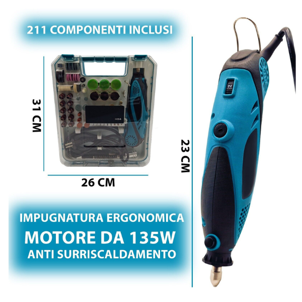 Kit Mini Trapano Multifunzione con 211 Accessori | 135W, Valigetta Portatile, Smerigliatrice e Fresatrice per Fai-da-te e Lavori di Precisione