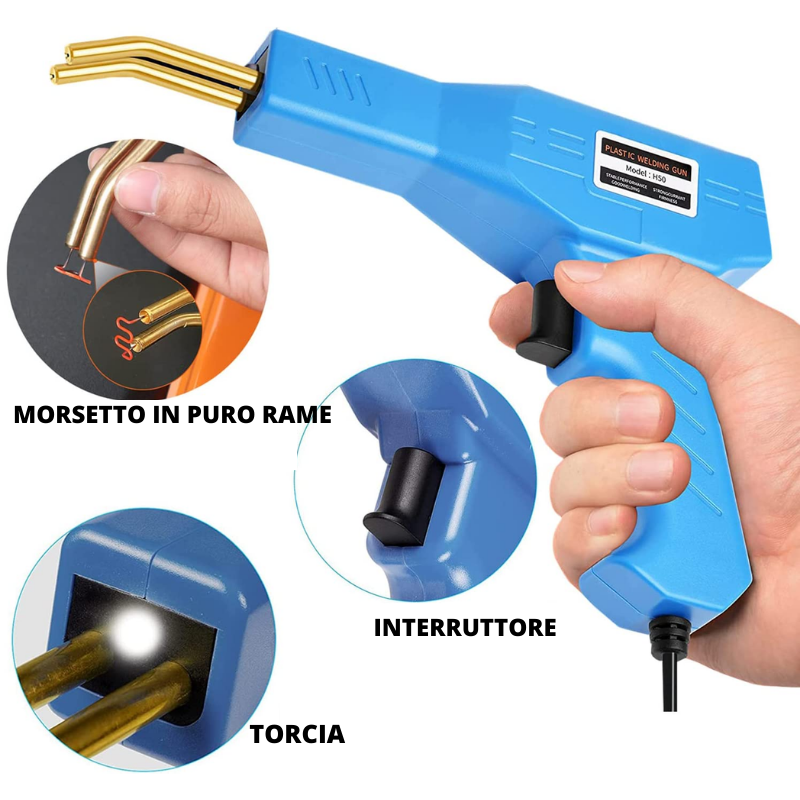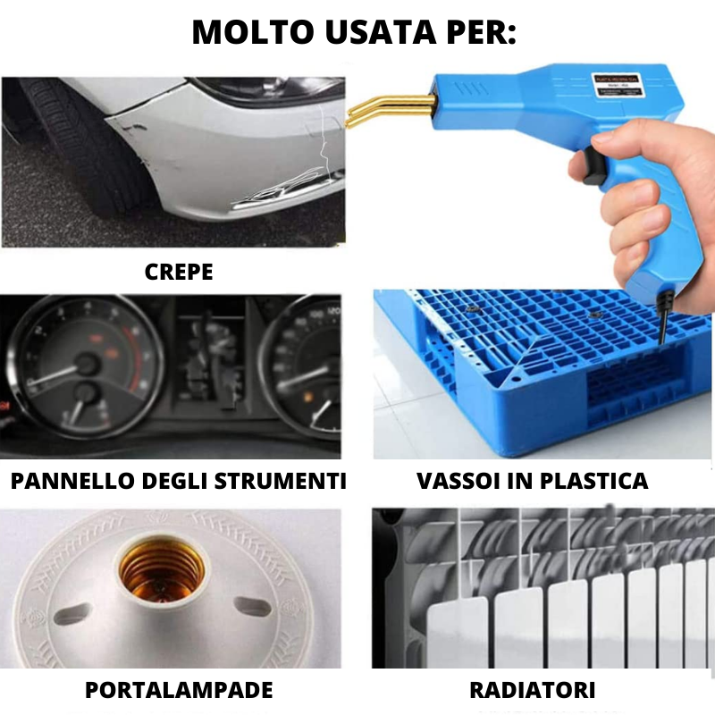 Riparazioni rapide e durature su ogni superficie in plastica. Il kit saldatrice LaPaginaDegliAffari da 50W è ideale per riparare paraurti, carene moto, plastica rotta, pannelli, staffe e componenti in modo professionale e sicuro. Dotata di impugnatura ergonomica e sistema di riscaldamento rapido, permette di lavorare in pochi secondi su qualsiasi tipo di plastica.