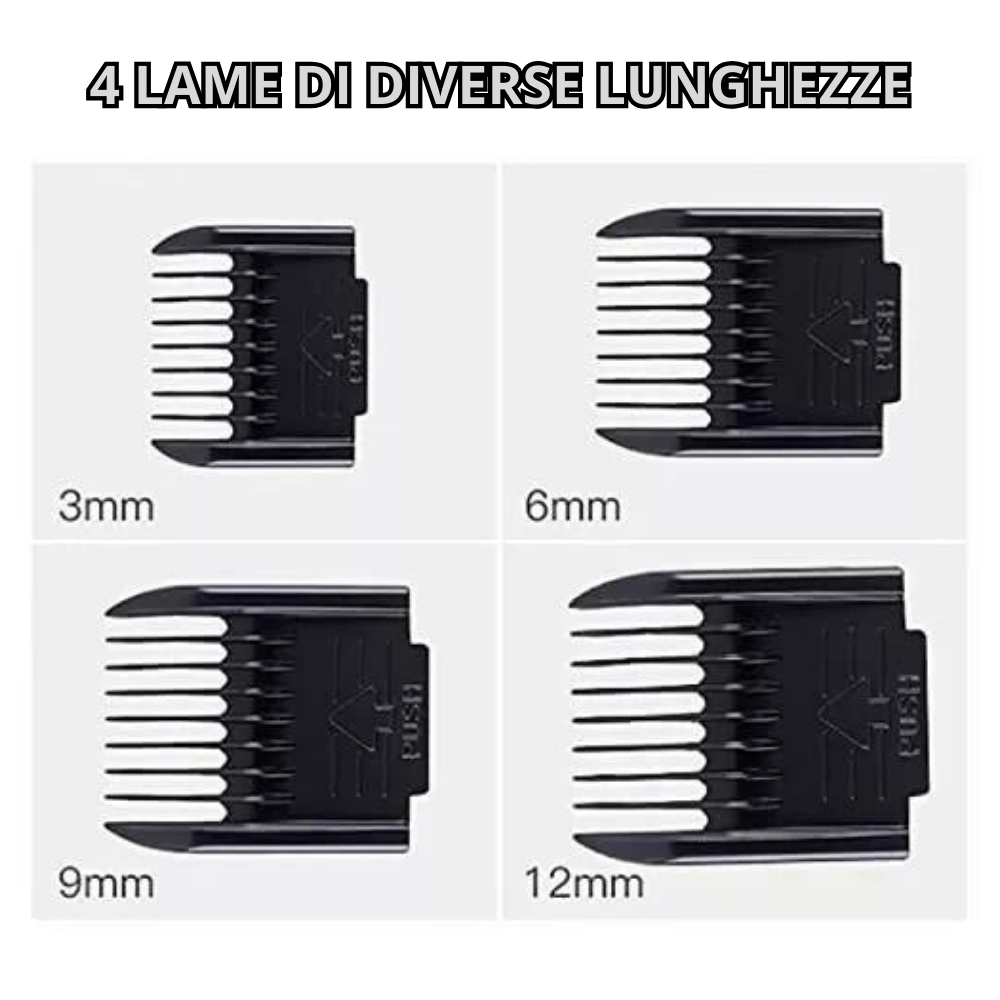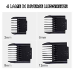 4 pettini inclusi (3mm, 6mm, 9mm, 12mm): per regolare facilmente la lunghezza del pelo