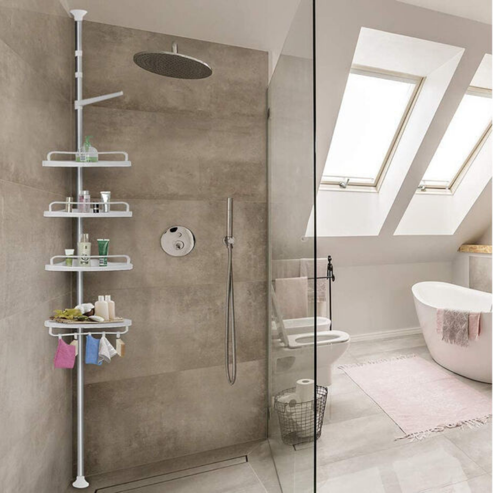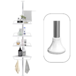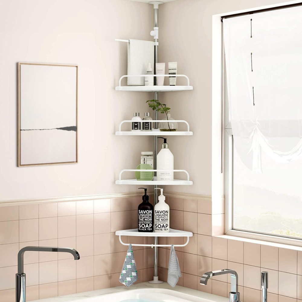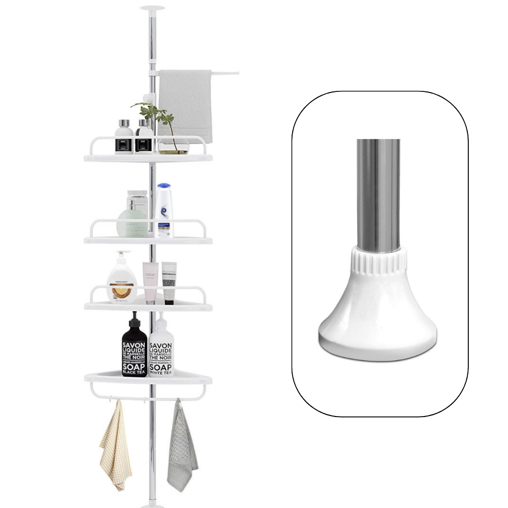 Scaffale angolare telescopico con 4 mensole regolabili, perfetto per organizzare shampoo, bagnoschiuma e accessori in bagno. Ideale per doccia o vasca, si installa senza forare grazie al tubo estensibile da 95 a 260 cm.