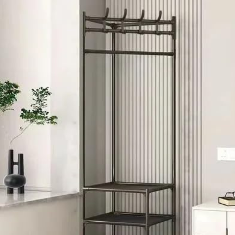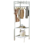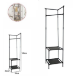 Scaffale multifunzione dal design angolare, ideale per sfruttare al meglio ogni spazio. Dotato di 2 ripiani e barra appendiabiti, è perfetto per tenere in ordine abiti, borse, cappelli e accessori.