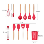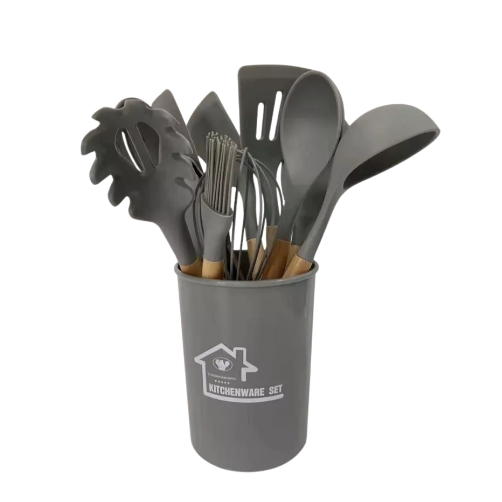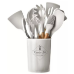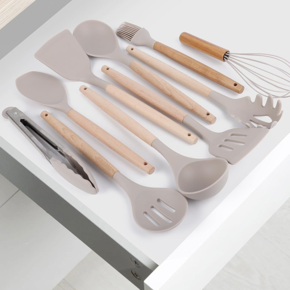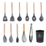 Set 11 Utensili da Cucina in Silicone | Antiaderenti, Resistenti al Calore, con Manici in Legno e Cestello Porta-Utensili