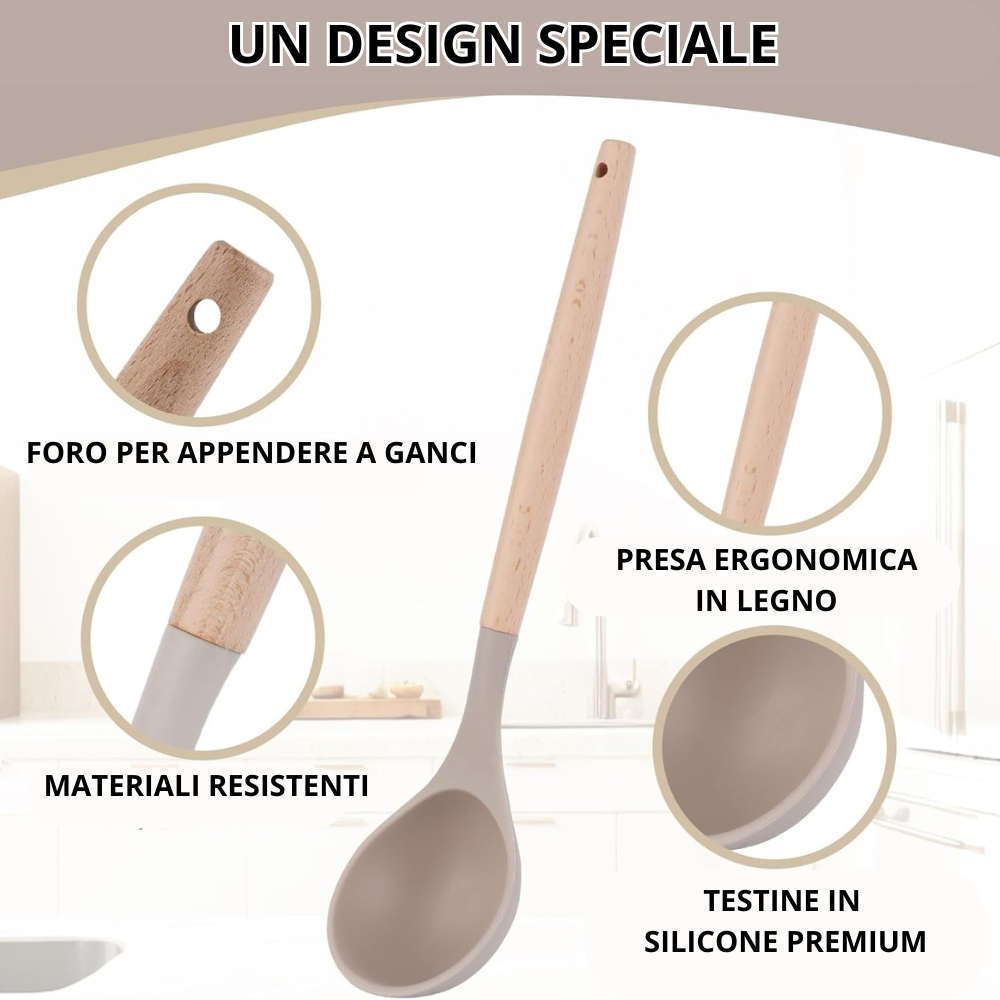 | Materiali | Silicone alimentare + manico in legno |