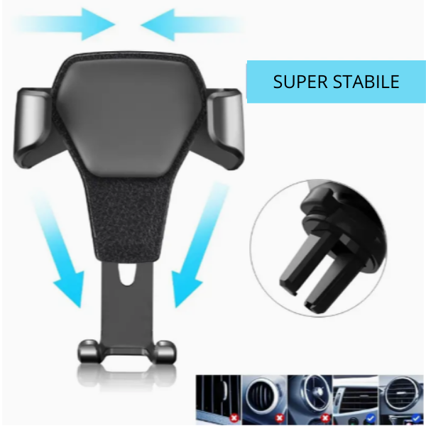 Si inserisce nelle bocchette dell’aria ed è molto stabile, non cade nemmeno su strade difficili da percorrere. Ha una forma triangolare che lo rende molto sicuro e ruota fino a 360° in base alle necessità del guidatore!