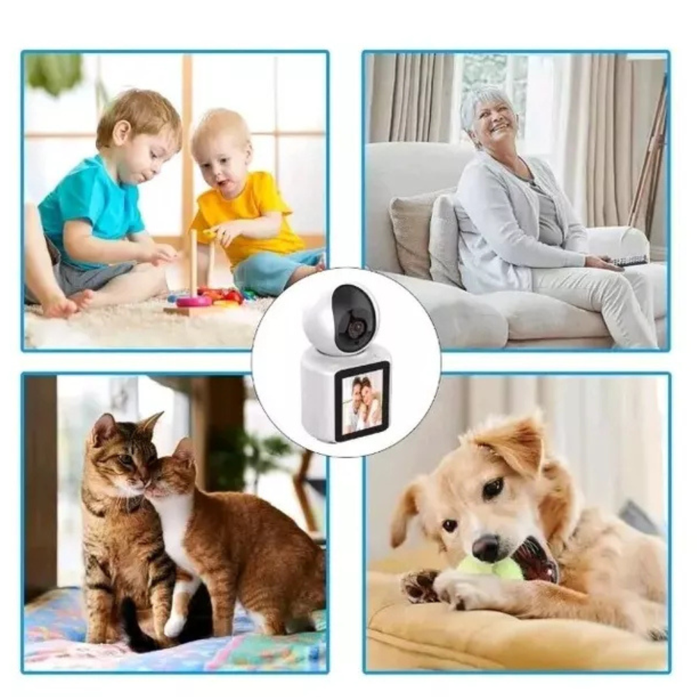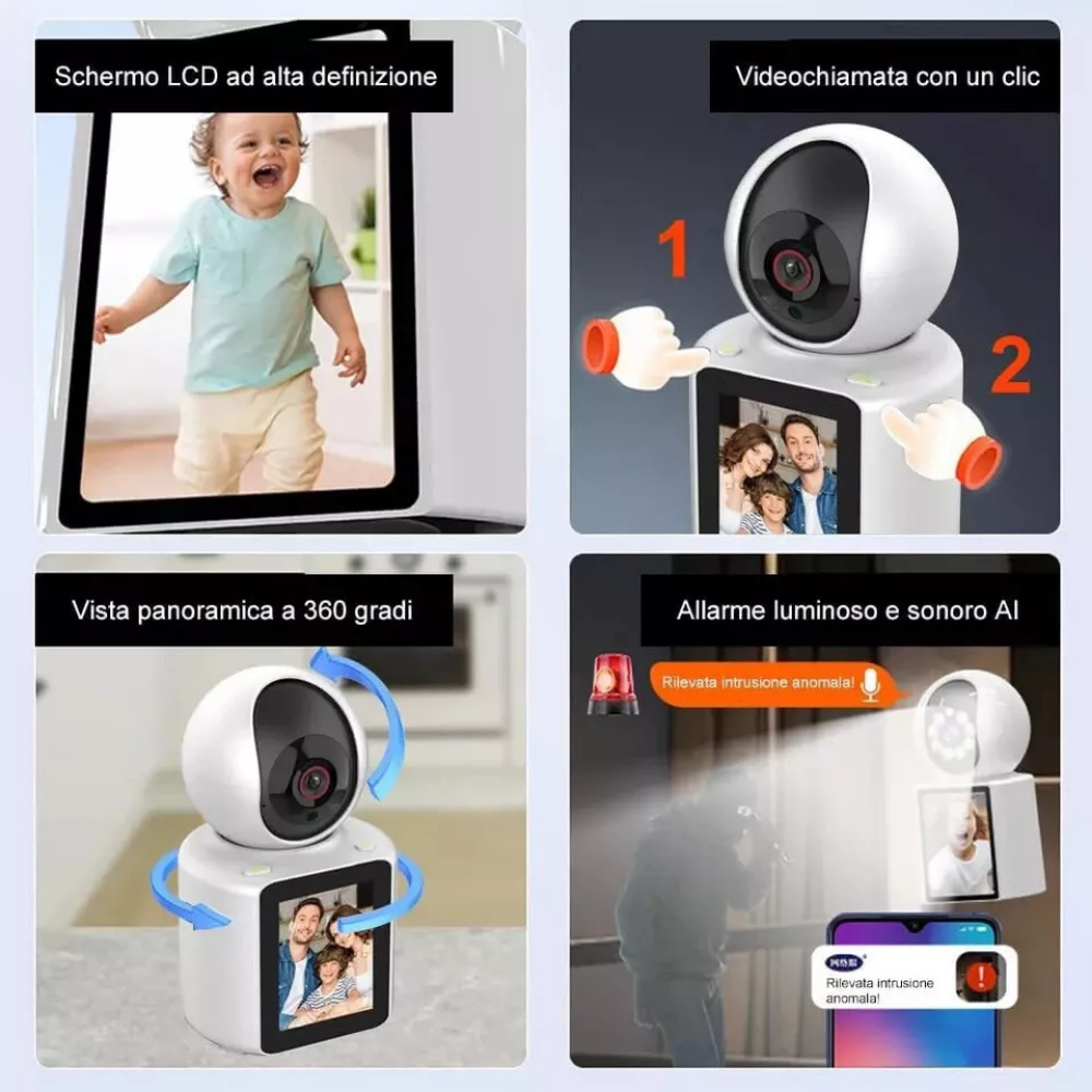 Sistema completo di sorveglianza domestica con schermo integrato, visione notturna e funzioni intelligenti. Ideale per sicurezza interna, baby monitor o videocontrollo animali.