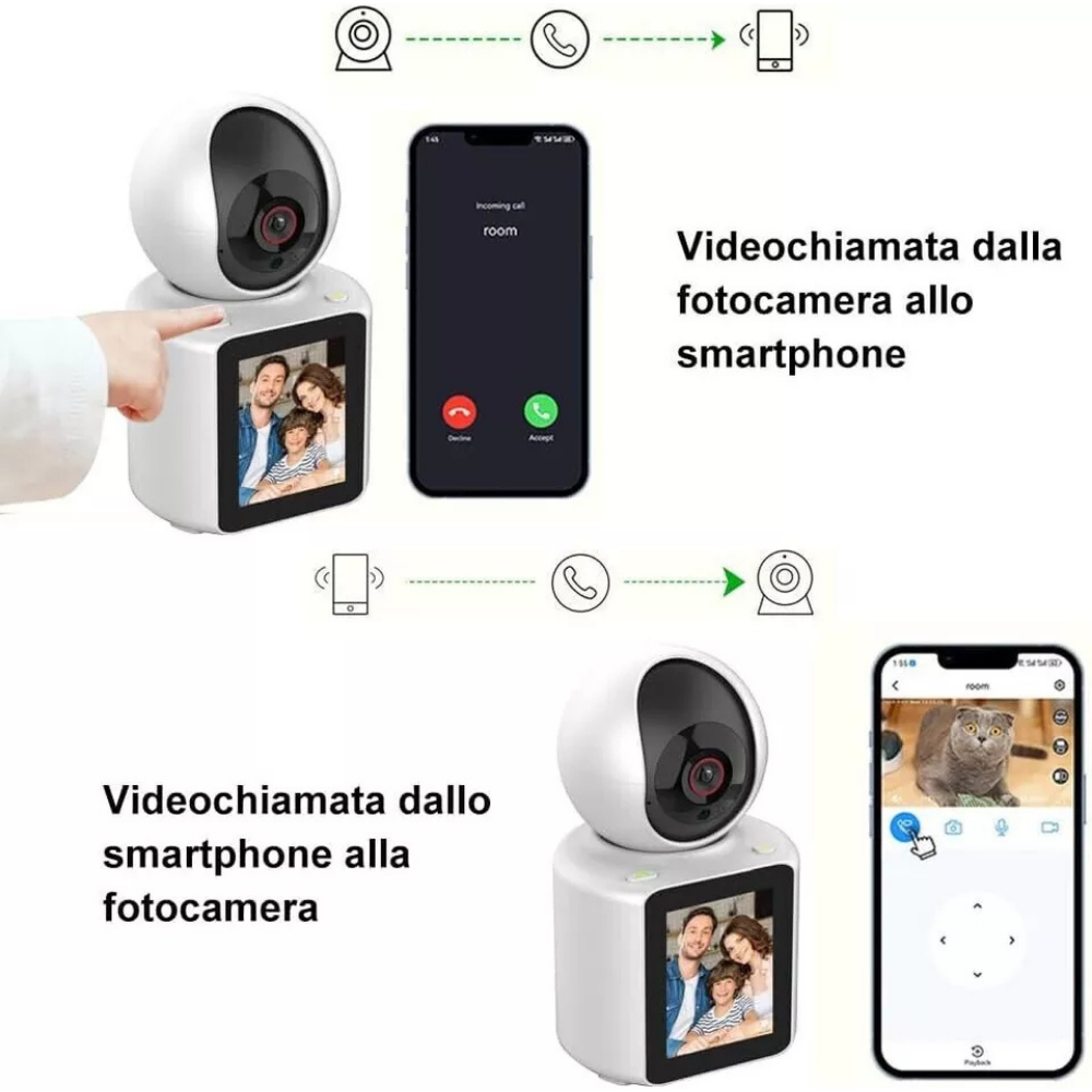 Telecamera IP WiFi con schermo 2.8", audio bidirezionale e visione notturna. Tracciamento AI, notifiche push e videochiamata. Acquista ora su Pezzellashop!