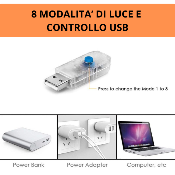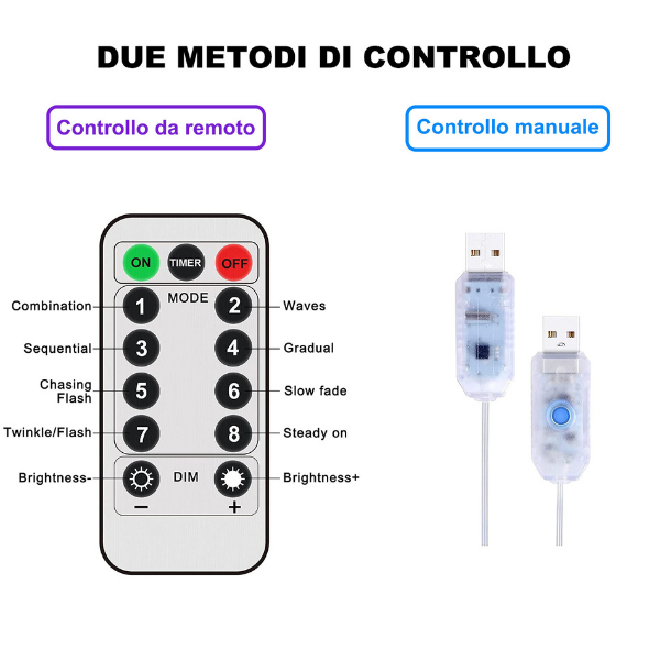 TELECOMANDO E FUNZIONE MEMORIA: Usa il TELECOMANDO per accendere/spegnere le luci, non è necessario collegare/scollegare tutto. La funzione memoria RICORDERÀ l’ultima impostazione selezionata, non è necessario riselezionare manualmente l’impostazione la prossima volta. Tuttavia, se scollegata dalla prsa usb la tenda luminosa non manterrà la memoria dell’ultimo gioco di luce.